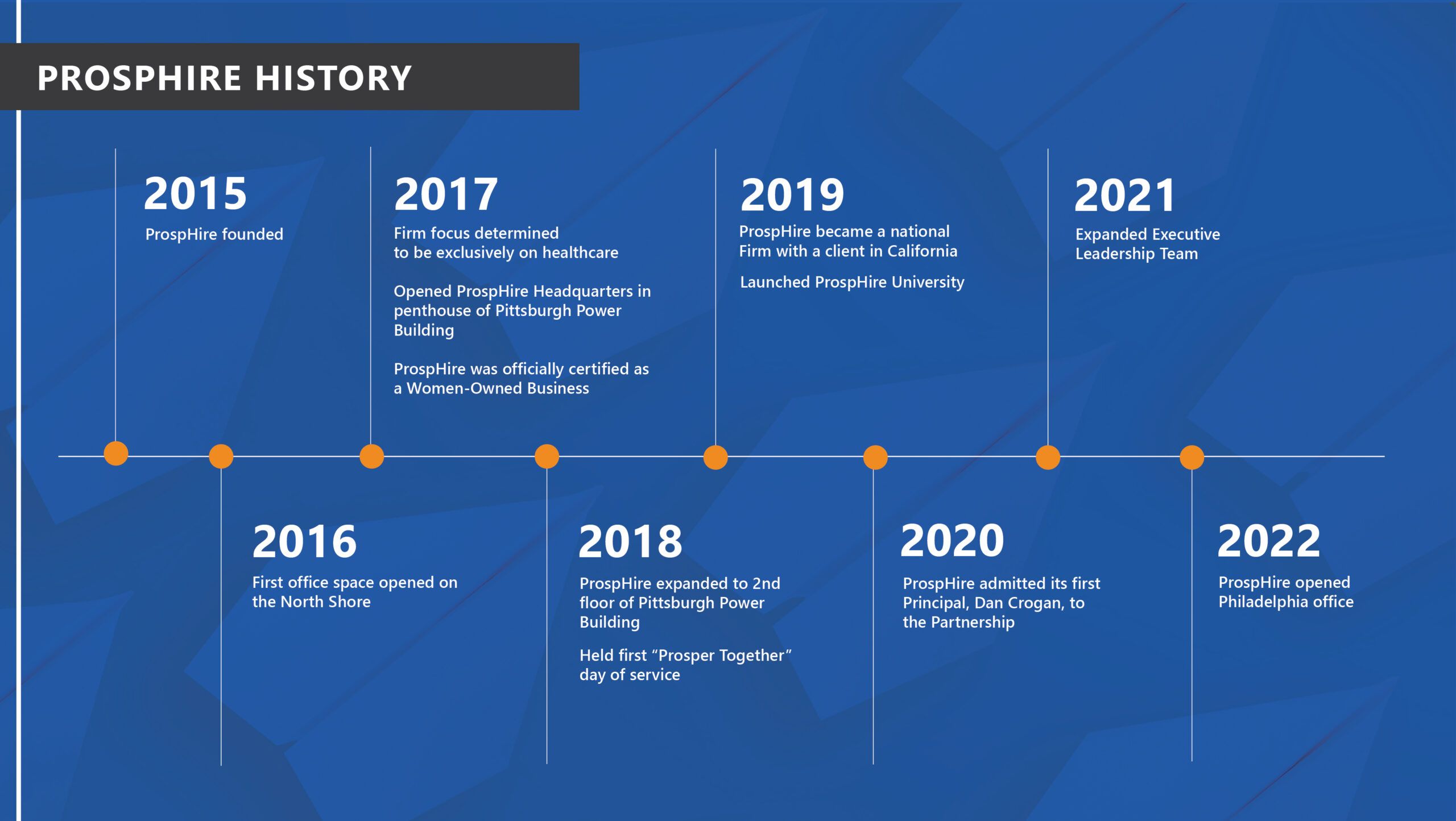 ProspHire made a strategic decision to focus exclusively on healthcare consulting. With this clear direction, the firm expanded into the penthouse of the Pittsburgh Power Building and earned its certification as a Woman-Owned Business, a testament to its leadership and commitment to diversity.