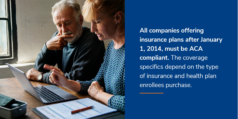 All companies offering insurance plans after January 1, 2014, must be ACA compliant. The coverage specifics depend on the type of insurance and health plan enrollees’ purchase. For instance, all companies with 50 or more employees must offer health insurance for their workers, but those with fewer than 50 aren't required to.
