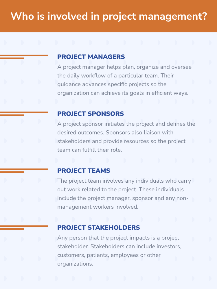 Project teams: The project team involves any individuals who carry out work related to the project. These individuals include the project manager, sponsor and any non-management workers involved.