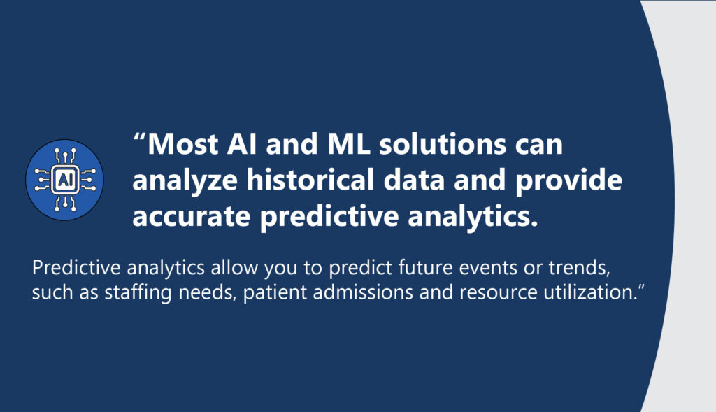 AI is also beneficial for project delivery. Most AI and ML solutions can analyze historical data and provide accurate predictive analytics. Predictive analytics allow you to predict future events or trends, such as staffing needs, patient admissions and resource utilization. With this information, you can identify and address project delivery challenges or disruptions before they occur.