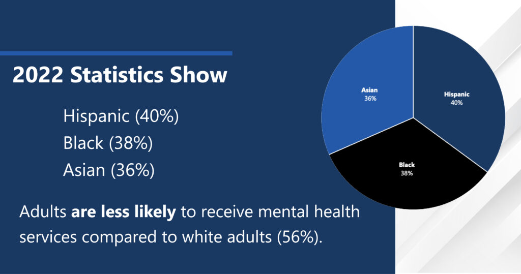 With over 40% of the U.S. population identifying as Black, Indigenous and People of Color (BIPOC), addressing the mental health needs of these communities is essential3. Mental health services are disproportionately less accessible to minority groups, with 2022 statistics showing that Hispanic (40%), Black (38%) and Asian (36%) adults are less likely to receive mental health services compared to White adults (56%)4. In 2020, fewer than half of African American adults received mental health care and in 2018, Asian Americans were 60% less likely to receive treatment compared to non-Hispanic Whites. Factors such as lack of health insurance, limited access to treatment and stigma significantly contribute to these disparities1. Raising awareness about these issues is crucial for advocating better mental health care and support for minority communities.