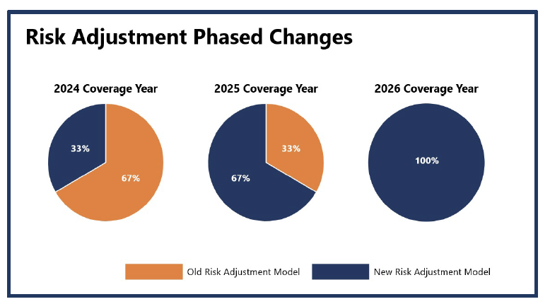 Overview: Within the CMS Final Rate Announcement, CMS has proposed changes to the Part C Risk Adjustment Model to eliminate coding variation and improve payment consistencies to MA plans year over year. Many commenters requested a phased-in approach illustrated on the right, as there will be large process changes and needed education; this approach has been utilized for model updates in previous years.