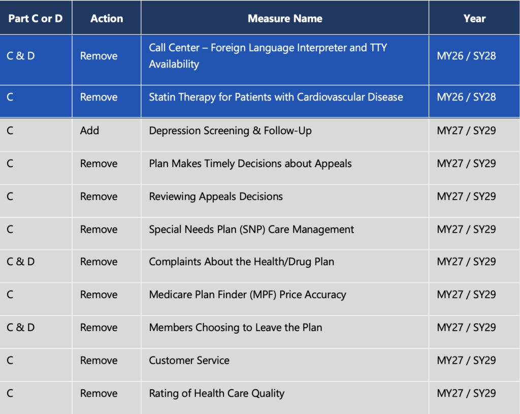 CMS is accelerating a shift away from administrative measures toward those that directly reflect member experience and clinical outcomes. As process-focused measures are phased out, performance will be driven by how members experience care and whether that care leads to meaningful health improvement, not how well processes are documented. While the Reward Factor remains in place and the Health Equity Index reward will not be implemented, the overall direction signals increased weighting on performance in areas that matter most to beneficiaries, including access, experience and outcomes. The table below outlines the 11 measure removals and additions that bring this shift to life across the Stars program.