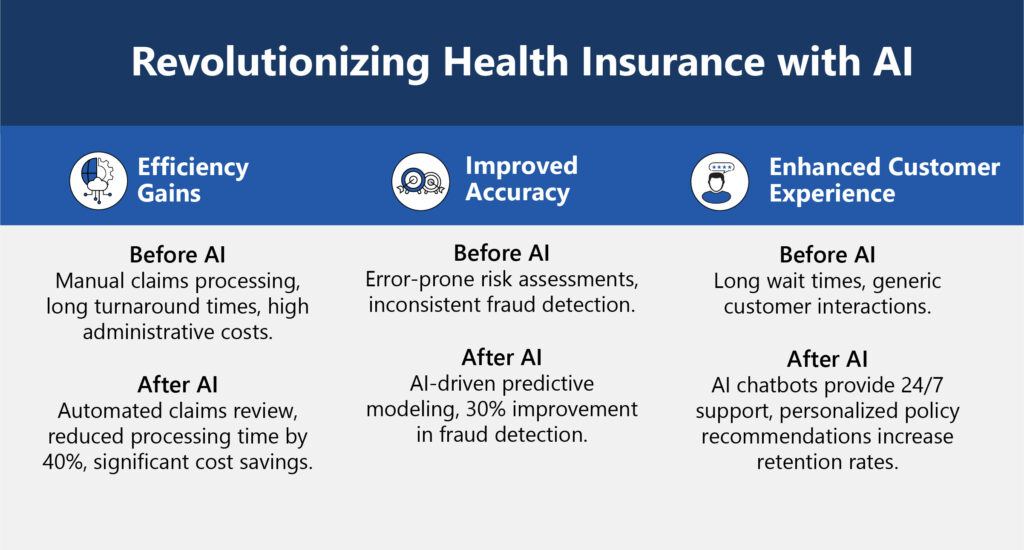 The accuracy of decisions in health insurance is paramount. AI algorithms, trained on historical data and equipped with machine learning capabilities, have significantly enhanced the accuracy of risk assessments, fraud detection and claims adjudication. This precision not only minimizes errors but also improves compliance with regulatory requirements, ensuring that insurers can confidently deliver on their promises to stakeholders.
