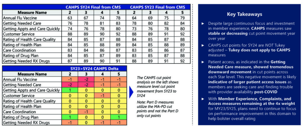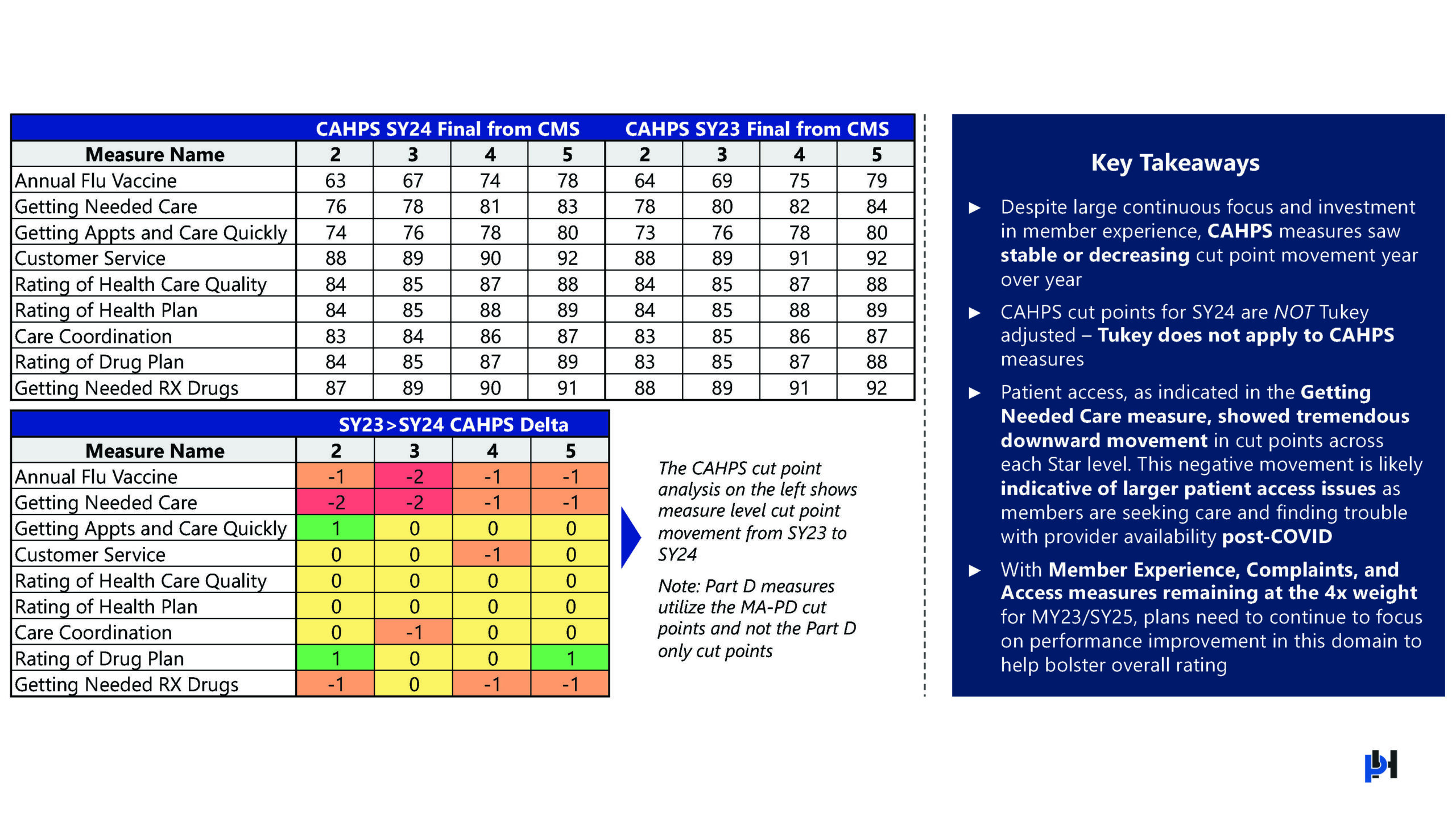 The second data release contained the publishing of contract level CAHPS data in HPMS. This CAHPS data also includes cut points for each measure. The ProspHire Medicare Stars team reviewed and analyzed the movement from Star Year 2023 to Star Year 2024.