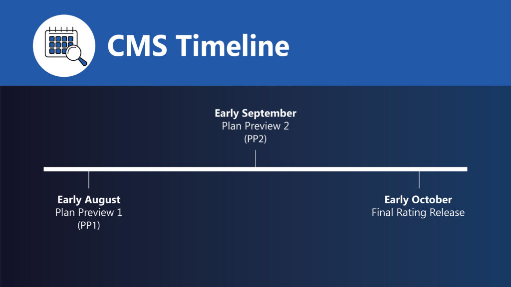 Early August: Plan Preview 1 (PP1) – Contract Measure-Level Scores (CAHPS base group cut points also released by CMS in early August)