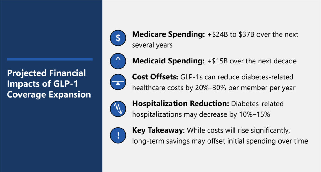 Cost Offsets: Studies suggest GLP-1 medications can reduce healthcare costs for diabetes-related complications by 20%–30% annually per member. However, it may take several years for these savings to offset initial spending increases.