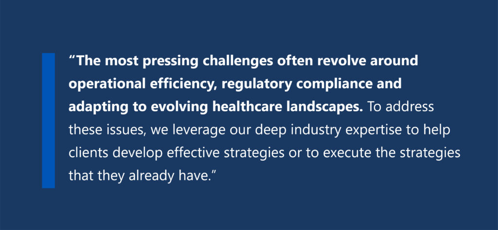 The most pressing challenges often revolve around operational efficiency, regulatory compliance and adapting to evolving healthcare landscapes. To address these issues, we leverage our deep industry expertise to help clients develop effective strategies or to execute the strategies that they already have. Our talented team of healthcare consultants bring the knowledge and experience needed to work closely with clients, fully understanding their business and becoming an extension of their team.