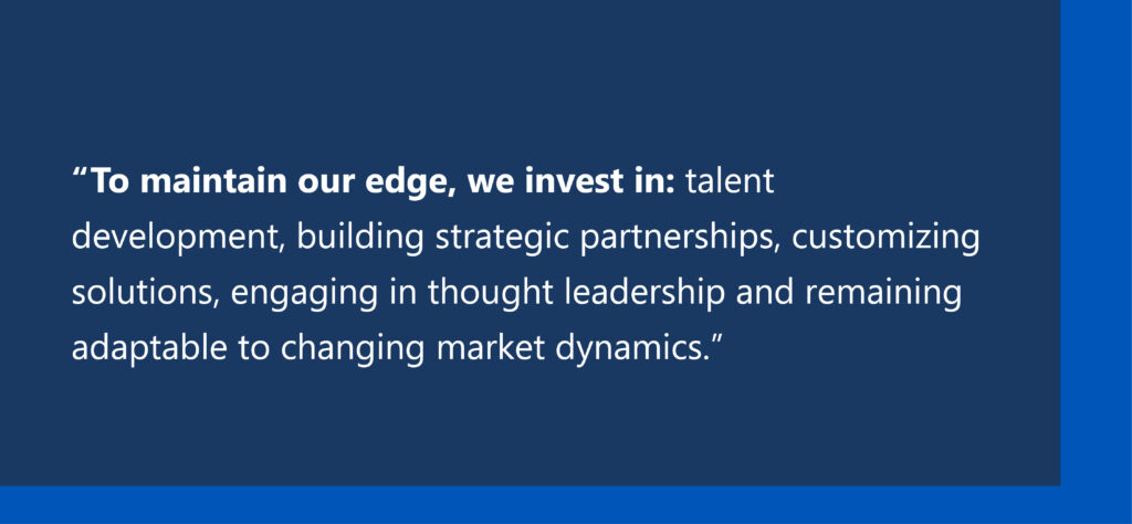 We’re always exploring new markets, both geographically and demographically. The potential for reaching new clients and leaders and expanding our footprint opens avenues for substantial growth. Deepening our industry partnerships can amplify our strengths and drive innovation to deliver exceptional value to our clients. The rapid pace of technological innovation presents endless opportunities for us to improve existing processes and streamline operations. Embracing emerging technologies can position us at the forefront of our industry. The future of our Firm holds immense potential for innovation, growth and positive impact. By focusing on these aspects, I am confident that we can build a prosperous and sustainable future for our employees and clients.