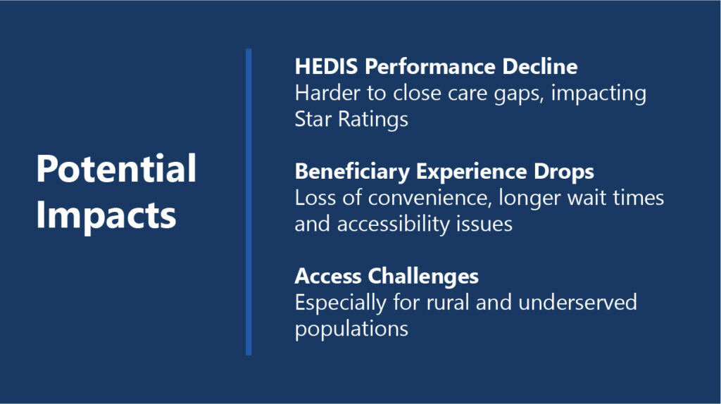 A decline in telehealth services could lower beneficiary satisfaction, reduce access to care, significantly impacting key CAHPS measures, hinder gap closure efforts and ultimately overall Star Ratings in some cases.