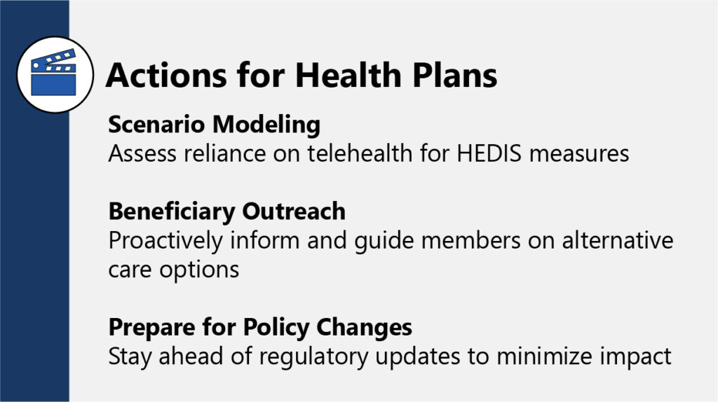 The reduction of telehealth coverage for Medicare beneficiaries would directly impact a beneficiaries’ access to care, making it harder for health plans to manage their health. This could lead to delayed chronic condition management and inadequate follow up care, all of which could lower Medicare Star ratings due to poor HEDIS performance. Without telehealth, many beneficiaries may face difficulty accessing these services, leading to unaddressed care gaps and lower performance across multiple HEDIS measures.