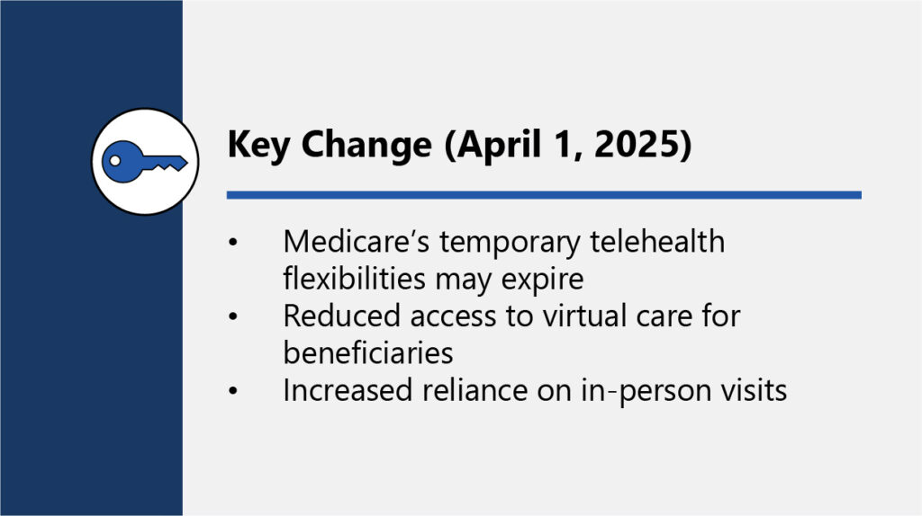 Beginning April 1, 2025, Medicare beneficiaries could face reduced telehealth coverage as the temporary flexibilities introduced during the COVID-19 pandemic expire, unless extensions are approved. These waivers, which allowed expanded access to telehealth services, will no longer be in effect. This shift could lead to access challenges for Medicare beneficiaries, especially those in rural or underserved areas.