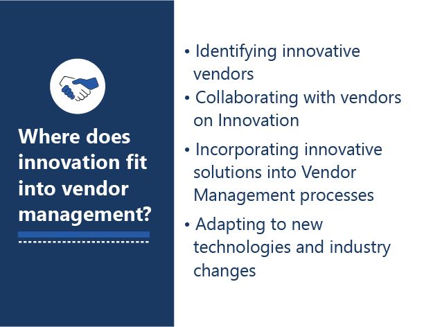 Innovation can play an important role in vendor management, especially as technology and other advancements continue to shape the way products and services are developed and delivered in the healthcare industry.
